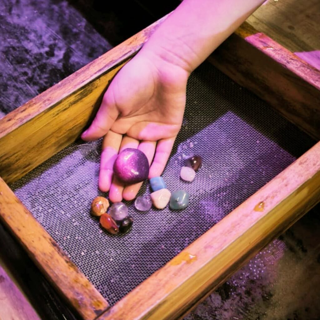 O próximo passo é escolher o balde com areia, onde estão escondidas as pedras preciosas que despertam diferentes energias.